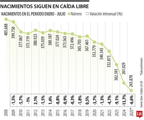 Colombia se está quedando sin bebés, según la actualización de las estadísticas vitales del Dane, entre enero y julio de 2025 se han registrado 243.870 nacimientos, lo que representa una reducción de 6,6% en comparación con el mismo periodo del año anterior. Las cifras son preocupantes, teniendo en cuenta que 2024 fue el de la menor cantidad de natalicios desde que se tiene registro. Según el Departamento Administrativo Nacional de Estadísticas, en lo corrido de 2025 hay un descenso más «moderado”…