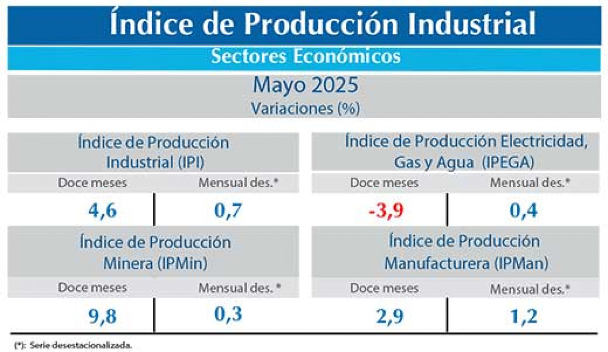 Un aumento en doce meses de 4,6% anotó en mayo de 2025 el Índice de Producción Industrial (IPI), debido a las incidencias positivas de dos de los tres sectores que lo componen, según informó esta mañana el Instituto Nacional de Estadísticas (INE). El Índice de Producción Minera (IPMin) tuvo un aumento de 9,8%, como consecuencia de la mayor actividad registrada en los tres tipos de minería que lo componen, destacando la minería metálica con un crecimiento de 10,1%, aportando 8,708 puntos porcentuales…