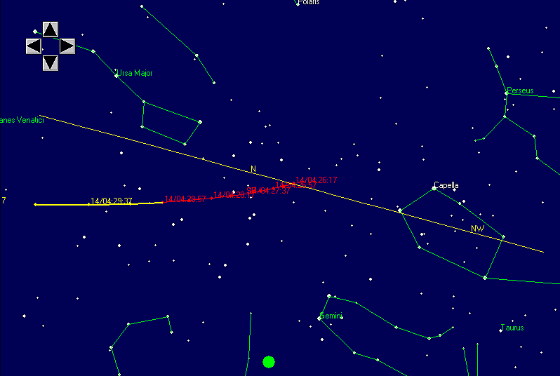 El ISS se convierte en el tercer objeto más brillante del cielo, después del Sol y la Luna, y podremos verlo el jueves 14 de diciembre en la madrugada. Te proporcionamos una mapa del cielo con la trayectoria del ISS pra esa oportunidad --haz click en la imagen de la derecha--, la línea en rojo muestra el horario en que será visible. ( Nota: tenemos duda sobre el horario exacto, puede haber una hora de diferencia, lo que confirmaremos oportunamente.)