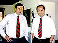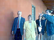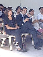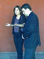 Foto iz.: ambos discutiendo. Foto centro: mientra se muestra a la Ministra Bachelet el Centro Cultural, ambos, a la derecha, discutiendo. Foto Der.: Durante la presentación de la Ministra, ella, del PPD, señalando con su pie izquierdo hacia la derecha; él, UDI, señalando con su pie derecho hacia la izquierda. |