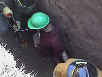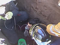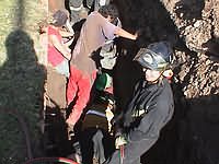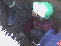 En la foto superior izquierda se divisa con el casco verde la cabeza de "Pato" , con el resto de su cuerpo bajo tierra. El nivel de ésta queda mostrado por la rodilla de su compañero que intentaba con una pieza de madera disminuir la presión que el tubo estaba ejerciendo. Al centro se ve el escaso espacio de la zanja para trabajar en el rescate, y, a la derecha, un Bombero con la cizalla hidráulica con la que procedió a cortar el tubo.