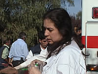 Luego de observar que además del suero se le habían entregado al paramédico dos jeringas y medicamentos, consultamos a la funcionaria que le acompañaba sobre qué se le había aplicado a Patricio. Quizás molesta por nuestra disimulada indicación de que era necesario proporcionar un casco al paramédico —en la foto central se observa a un Bombero colocándoselo—, respondió en tono altanero "Nada ¿Por qué?".