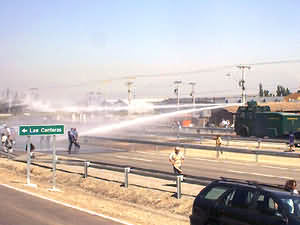 Colina, Sábado 14 de Octubre de 2000 Se desarrolló hoy un nuevo acto de protesta en Las Canteras donde pudimos apreciar un insólito despliegue policial que llegó a tempranas horas de la mañana al interior del poblado. A esto se agregó la utilización de el carro lanza aguas, cuando ya no era necesario y se estaban levantando las barricadas que interrumpían el tránsito, con una dosis de químicos disuasivos sólo como se usan en incidentes graves. |