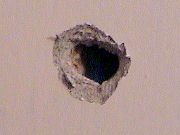 Arriba: orificio de salida del proyectil en el muro del baño.